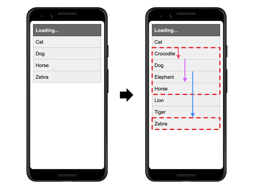 In the first frame above there are four results of an API request for animals, sorted in alphabetical order. In the second frame, more results are added to the sorted list creating an unexpected layout shift.