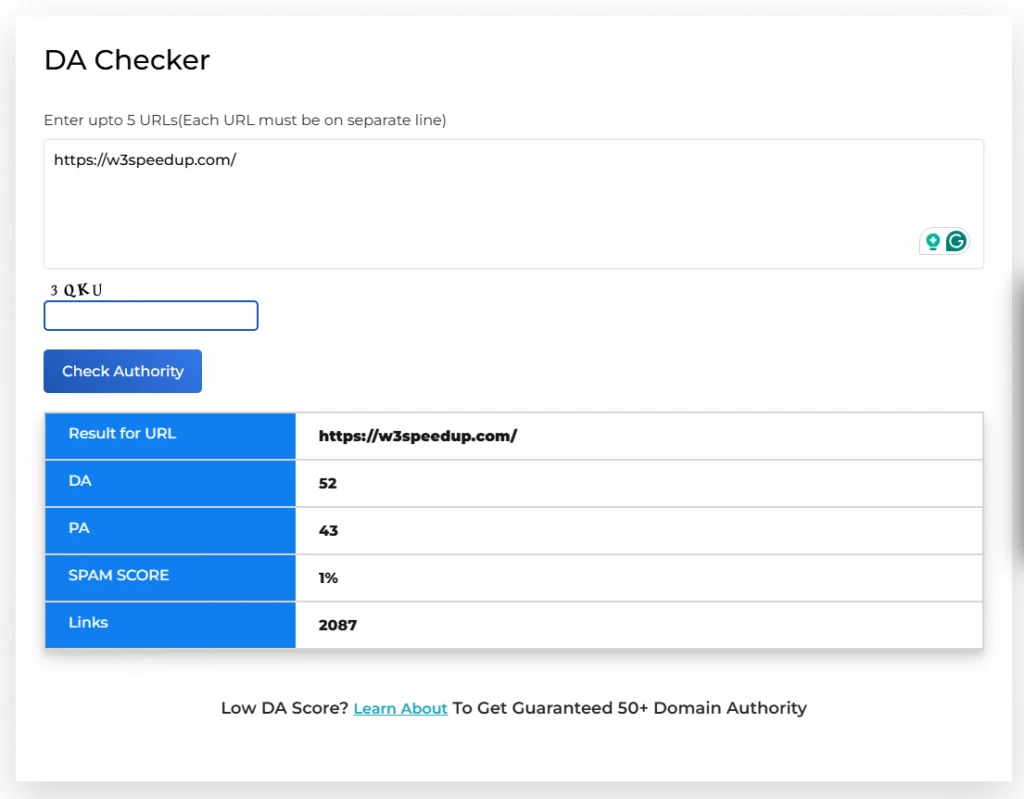 W3 SpeedUp’s DA checker tool uses reliable algorithms to ensure that the provided DA scores are trustworthy and accurate.